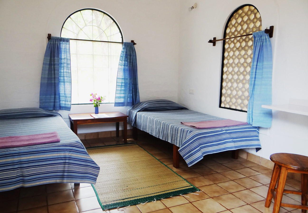 Twin rooms are ideal for up to two adults, offering a serene garden view and a peaceful, non-smoking environment. Equipped with a fan to keep you cool, the room provides simple comfort and a connection to nature. Guests have access to either a shared or detached washroom, making it a suitable choice for those seeking a quiet and friendly stay.
